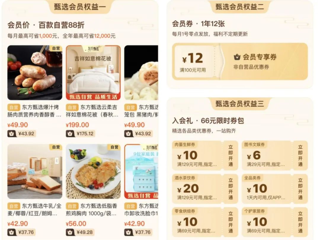 东方甄选的年费会员有三个核心权益,第一是百款自营产品享有88折,第二是每个月可以获得一张“满100减12元”的会员专享券,第三是合计66元的限时券包。