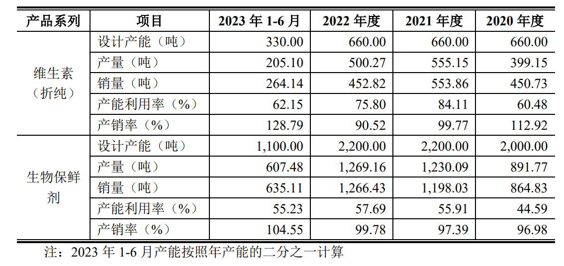 根据圣达生物的回复,公司维生素(折纯)产品产能利用率分别为60.48%、84.11%、75.80%和62.15%,生物保鲜剂产品产能利用率分别为44.59%、55.91%、57.69%和55.23%。![]()