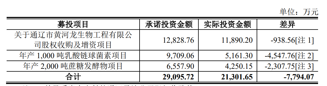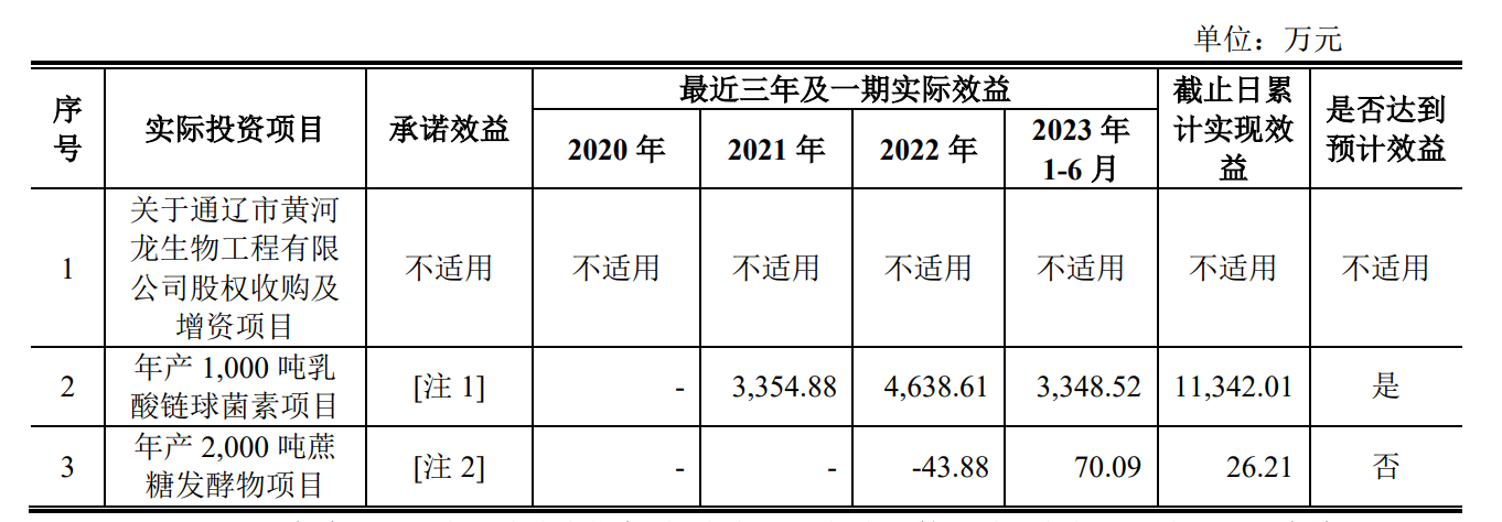 截至2023年6月30日,前次募投三大项目中,仅“年产1,000吨乳酸链球菌素项目”一个项目达到预期效益。公司表示,在项目建成投产后,仍不排除出现产业政策调整、行业走向改变、市场环境变化、公司经营波动等内外部因素导致募投项目实施具有不确定性,因此公司存在项目建成后无法达成预期效益的风险。