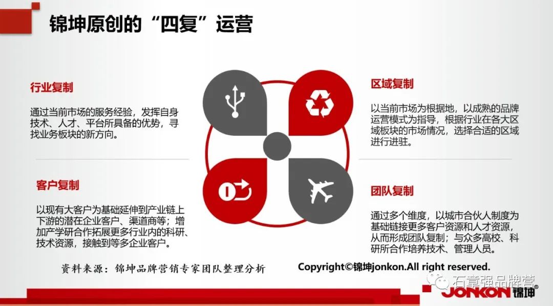 在明确了单店如何爆破、标杆市场如何打造后,后续如何实现企业的扩展就会提上日程。企业的底层运营跑通需要针对区域、行业、客户、团队的全部跑通完善。当企业发展到一定体量和规模后,后续的扩大及二次发展就是需要考虑的重点。锦坤认为,B端企业面临寻找二次生长曲线时,需要通过“四复”,即行业复制、区域复制、客户复制、团队复制来跑通底层运营。
