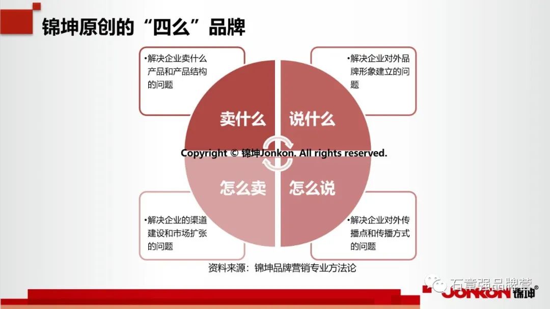 在品牌定位已经为企业明确发展宏观方向的前提下,如何把企业发展方向形成战略纲领,也就是品牌顶层设计,就成为企业的当务之急。品牌顶层设计在企业的发展过程中非常重要,在上文盘整各行业龙头的发展脉络时,也时时刻刻可以见到品牌顶层设计的影子。海康威视、科大讯飞走上龙头宝座的历程,都离不开清晰的战略规划指导。定位为企业的顶层设计注入了灵魂,而锦坤“四么”——卖什么、说什么、怎么说、怎么卖的顶层设计就是由定位延展而来。