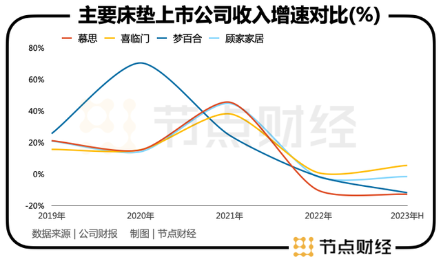 节点财经梳理发现,2022年及2023年上半年,慕思是床垫类上市公司营收增速最“颓”的公司,公司连续出现超过10%的负增长。