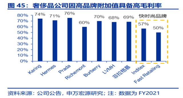 据申万宏源研究梳理,2021年LVMH、开云集团、历峰集团等奢侈品巨头的毛利率均在60%-80%之间。