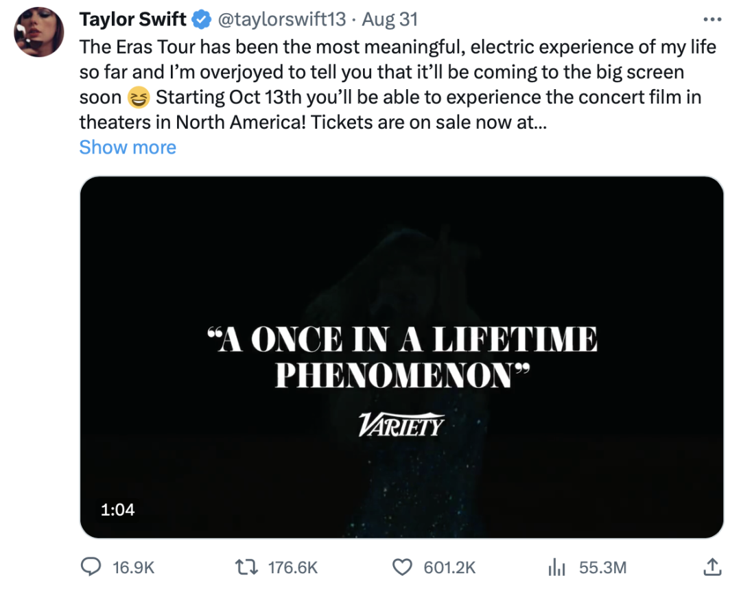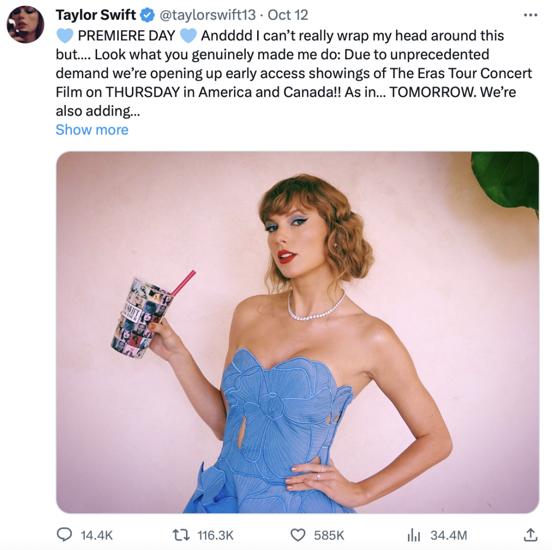 8月31日,泰勒·斯威夫特在X(前身为Twitter)发布消息,电影即将于10月13日上映。Comscore高级媒体分析师Paul Dergarabedian评价道,“一部电影从宣布之日起就出现如此迅速的转变,然后几周后就在大银幕上映,这是前所未有的。”