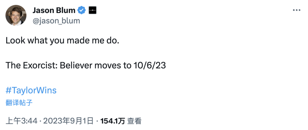 “泰勒狂潮”让同档期电影选择绕道避让。泰勒·斯威夫特宣布她的电影定档几个小时后,环球影业紧急决定《驱魔人:信徒》提前一周上映,制片人Jason Blum在X上确认了这一消息,“看看你让我做了什么”,标签为#TaylorWins。