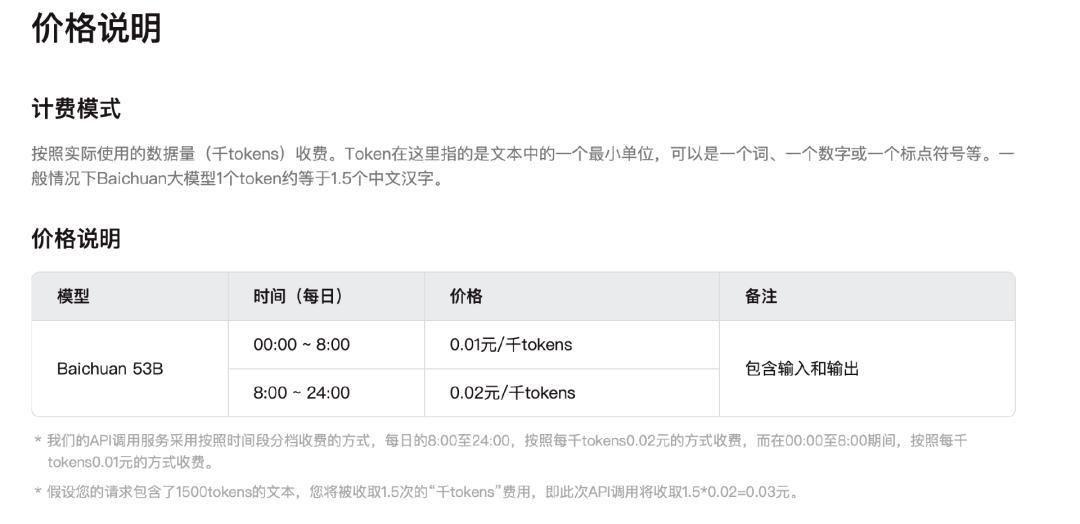 如今的商业化,集中在了Baichuan2-53B,官网显示,该模型的API调取采用了分时段收费标准。0:00-8:00收费为0.01元/千tokens,8:00-24:00收费为0.02元/千token,相比较之下,白天的收费价格要高于晚上。