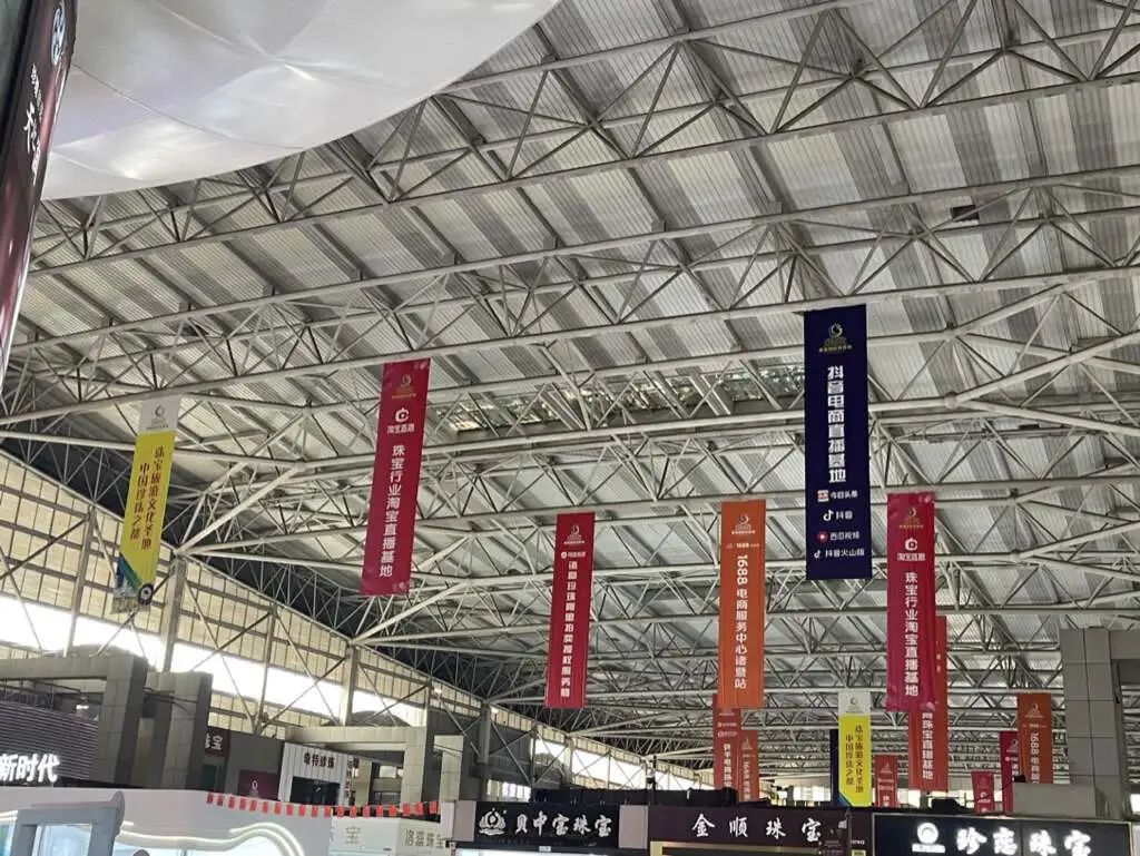 珠宝城展馆顶部的横梁上,布满了淘宝、抖音、快手等多个平台的大型条幅。“据说接下来视频号、小红书也要来这设立直播基地”,周斌说道。
