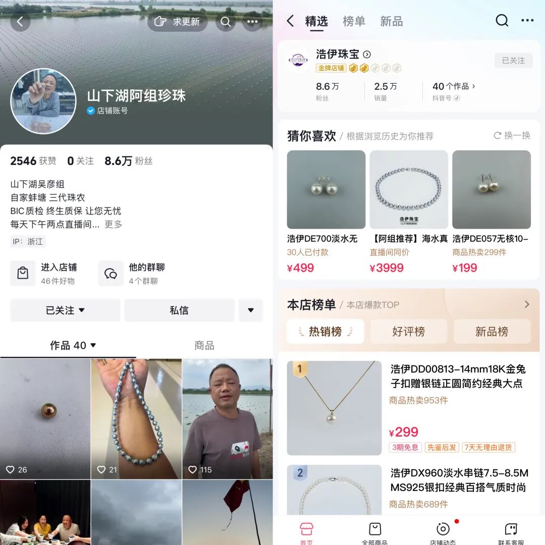 “2021年我刚开始做珍珠直播的时候,50岁以上的客户占比五六成,这两年主力客户已经过渡到25-35岁左右,明显年轻很多”,抖音账号“山下湖阿祖珍珠”负责人周斌明显感知到这一变化。从事直播之前,他家三代都以在山下湖养蚌育珠、零售批发珍珠为生,他的ID名也由此而来。