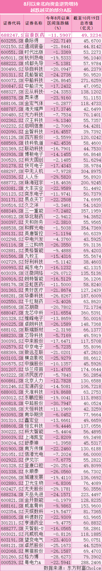 值得注意的是,虽然近期北向资金整体持续净流出,但与此同时,今年8月以来,有千余只A股获得了北向资金逆势增持,其中不少中小市值个股令外资越跌越买。
