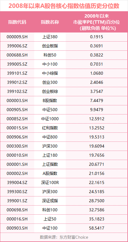 从2008年以来至今年10月19日的历史市盈率(TTM)分位数(剔除负值后)来看,A股各大核心指数的估值水平其实差别较大。一方面,目前创业板指数、创业板综指的估值分位数在5%以下,显示这些指数的估值目前处于近15年来的最低水平;另一方面,上证50、中证100的估值分位数在35%以上,显示这些指数的估值目前处于近15年来的中等水平。而3000点附近的上证指数的估值分位数在20.7%,为近10多年来的偏低水平。