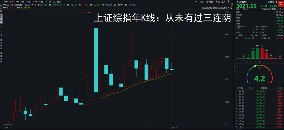 在大盘逼近3000点之时,安信证券金工团队10月19日发布点评坦言:“中长期看,上证过去30多年从未有过年线三连阴,而且过去30多年的大级别调整经验表明,一旦调整进入到18年与20年均线区域,随后或将迎来较大级别的反弹;当前上证已经进入该区域,或已进入最佳左侧时间。另外,对今年四季度保持乐观的券商不在少数。”