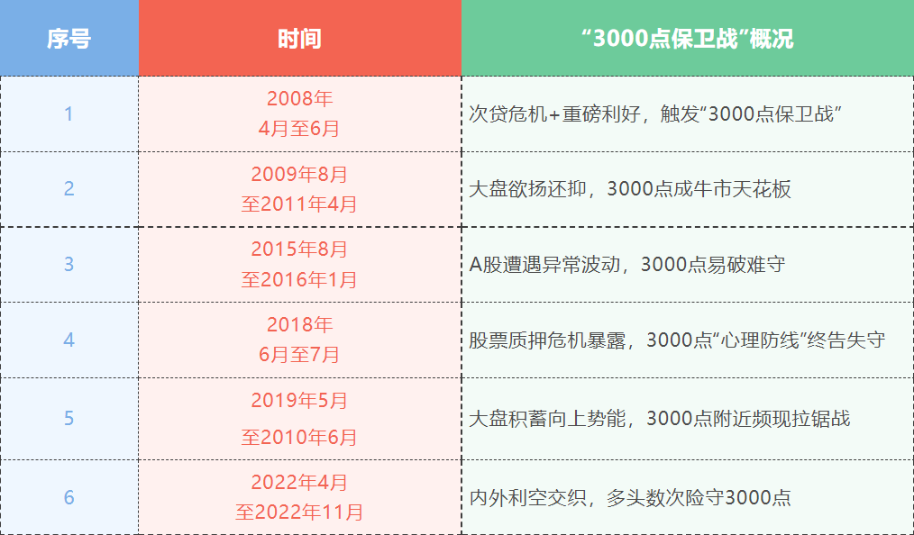 细数A股历史上的“3000点保卫战”(时间范围从“3000点保卫战”触发至阶段性结束),有6次总是反复被市场提及: