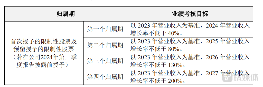 公告显示,本次股票激励计划首次授予及预留授予限制性股票的解除限售对应考核年度为2024年—2027年四个会计年度,每个会计年度对公司的业绩指标进行考核。以2023年营业收入为基数,公司2024年—2027年的营业收入增长率需分别不低于40%、80%、130%、200%。