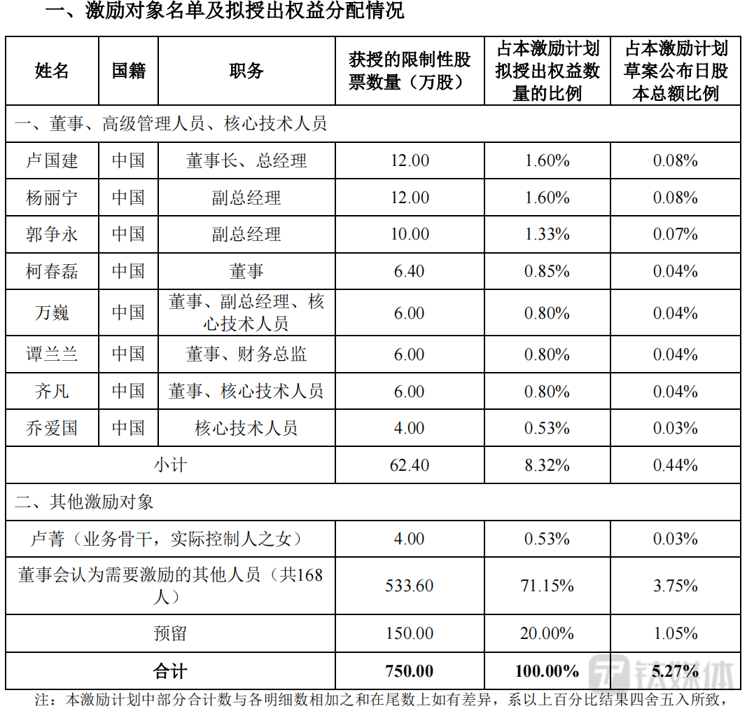 值得注意的是,本次实际控制人卢国建之女卢菁亦获授4万股限制性股票,占比为0.53%。对此,公司称卢菁为其业务骨干,对公司产品开发、业务拓展等方面起到重要作用,因此将其纳入本激励计划。