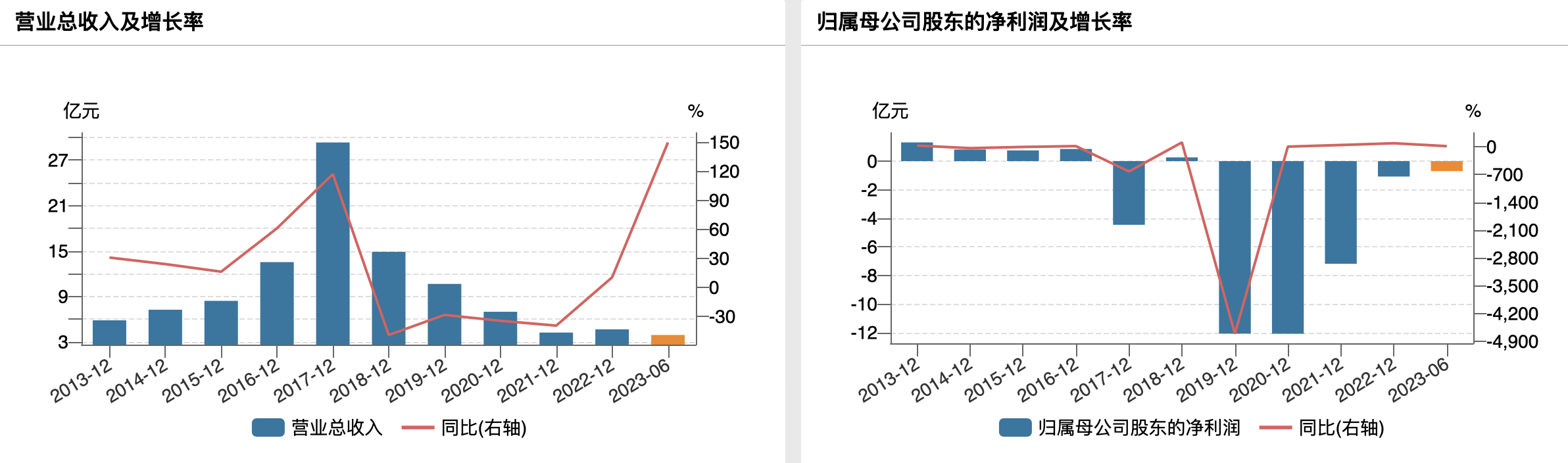 而从业绩来看,公司已连续亏损多年。2020年至2022年的归母净利润分别为-12.09亿元、-7.19亿元和-1.08亿元,2023年上半年公司延续亏损态势,归母净利润为-0.70亿元,短短三年半巨亏21.06亿元。