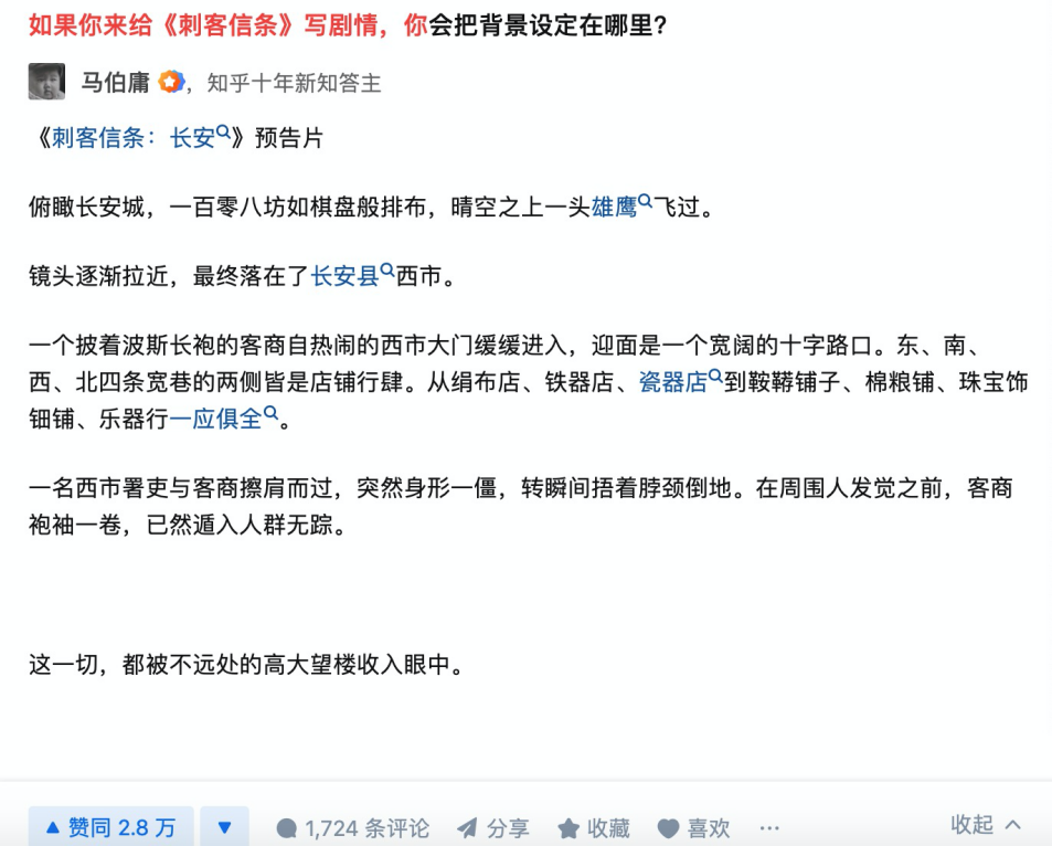 最知名的是马伯庸根据“如果你来给《刺客信条》写剧情,你会把背景设计在哪里?”,写出了《长安十二时辰》并被曹盾导演拍成了剧。2019年“为什么后宫中嫔妃们一定要争宠?”的提问下催生了三大虐文之一《宫墙柳》,在当时以“反雌竞”“反宫斗”独特情节风靡各大平台,B站也随即出现了同人视频、有声书等二创作品,帮出作品进一步出圈。