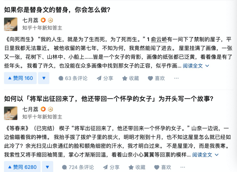 相比传统平台的网文IP,知乎IP最特别之处是依托于它自身的高质量问答社区。常言道最好的小说通常都能用一句话来高度概括。知乎流行的“根据一句话扩写一部小说”,拥有强服务性和互动性,起初,提问者只需给一个设定,就有感兴趣的创作者将这个灵感延续下去,以此为基础创作文学作品。