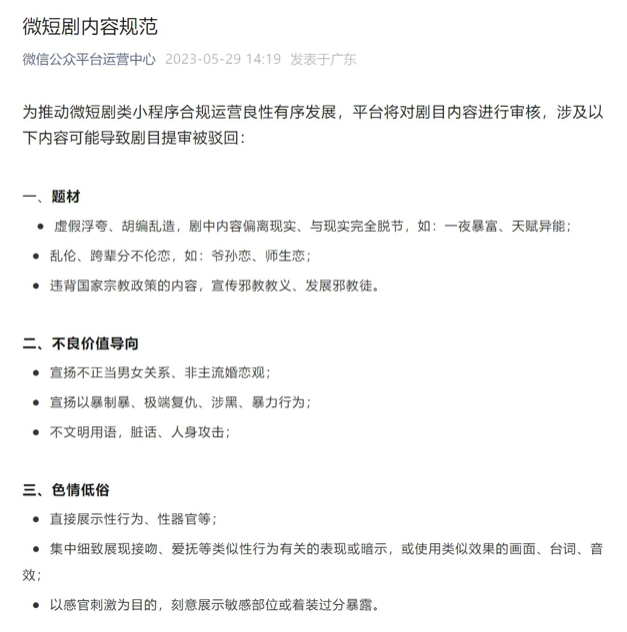 从今年5月微信发布的《微短剧小程序运营指引》中可以看到,提供网络短剧播出服务的小程序主体,需具备《广播电视节目制作经营许可证》并按要求通过平台完成主体备案登记。而平台也将对剧目内容进行审核。