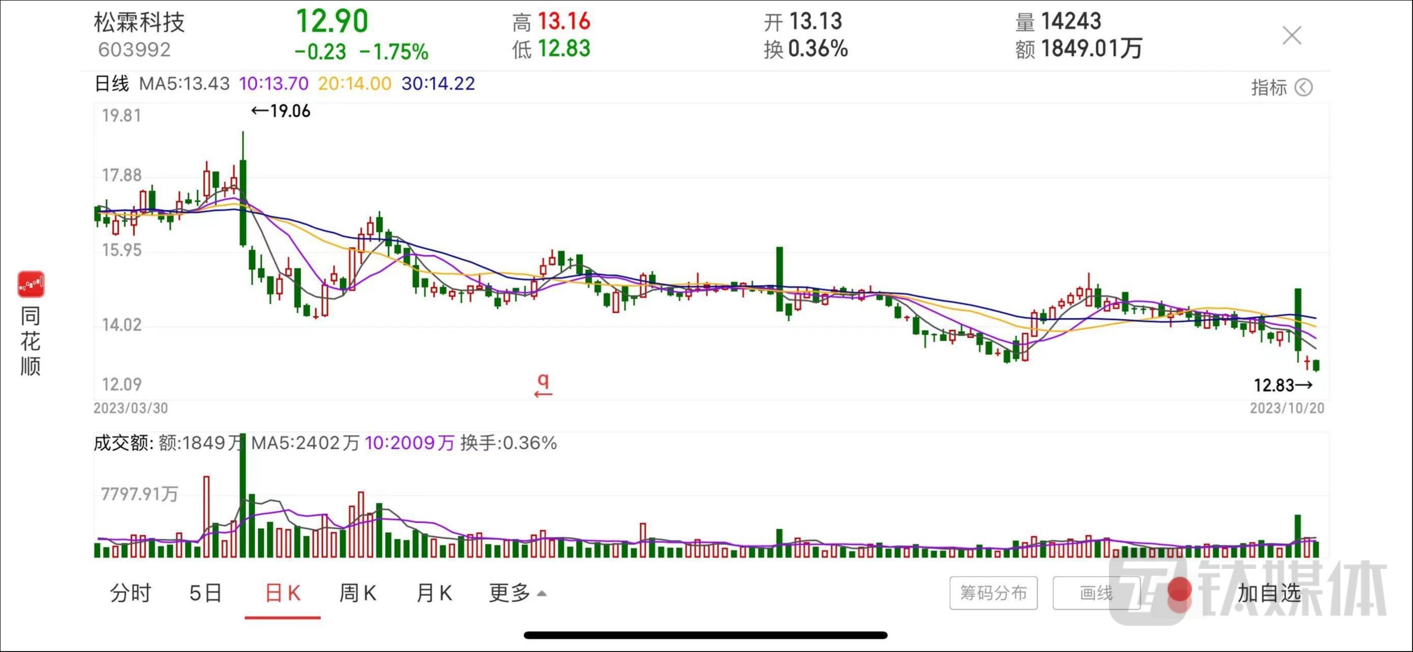 二级市场方面,松霖科技股价自4月24日盘中创下2023年峰值19.26后,公司股价震荡下跌,截至10月20日收盘,公司股价报收12.9元,跌幅1.75%,当前总市值为51.73亿元。