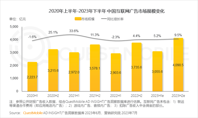 据QM数据,从2023Q1开始,中国互联网广告市场开始恢复增长,Q1的规模达到1462.2亿元。当前互联网广告行业的增长虽然不及2021年的表现,但相比2022年,已经出现了上扬的趋势。
