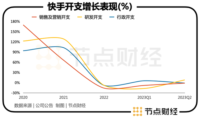 2023年的一、二季度,快手依然在降本增效。一季度的销售及营销开支同比减少7.65亿元,研发开支同比减少6亿元,行政开支同比减少0.7亿元。