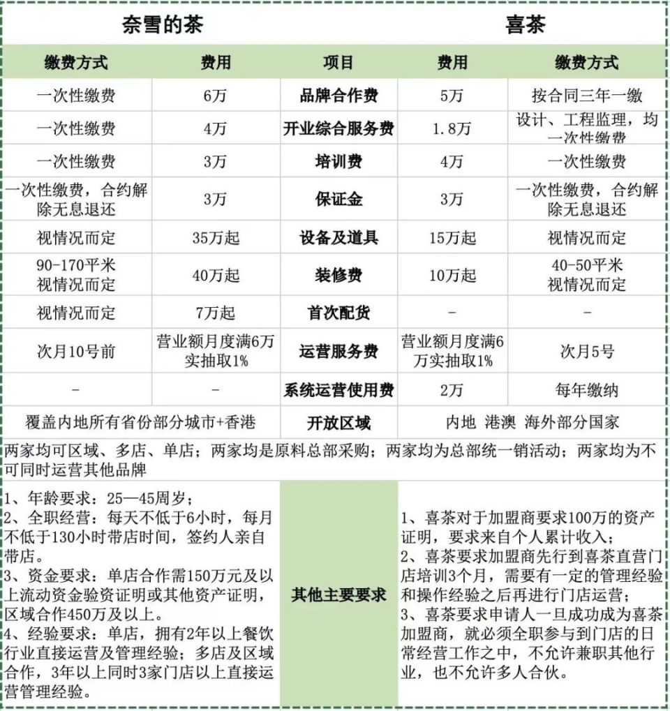 据不完全统计,上述费用总计超过98万元,且还不算房租、员工工资等日常支出。相比喜茶40.8万元、蜜雪冰城37万元的“加盟费”,综合来看,奈雪的加盟“门槛”显然更高。