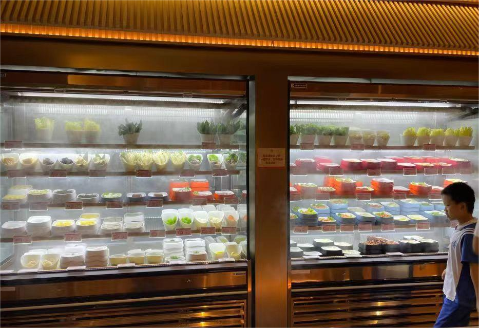 不同于海底捞的门店,嗨捞火锅是采取“半自助式”自取模式,除了锅底和肉类、小吃、主食等需要点单,其他菜品如蔬菜、菌类、丸子、豆制品等,都可以从橱柜里自取,结账时根据盘子核算费用,这点与串串火锅相类似。