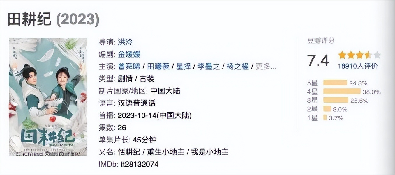 断更后的首个更新日,《田耕纪》在猫眼剧集热度榜上的霸榜势头被打破,豆瓣评分也下滑至7.4分。——今年8分剧“爆发”的剧集市场,这个成绩不算好。