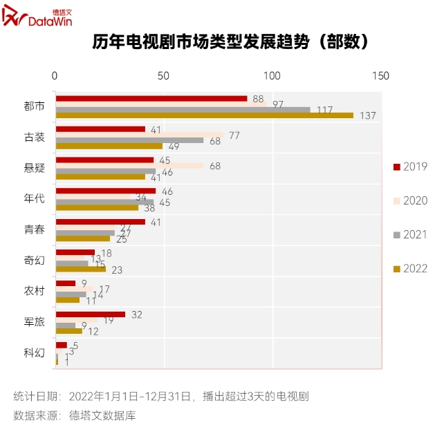 减产热门题材,买股小众题材,看似是在“舍近求远”,而爱奇艺和优酷会做出这样的选择,和剧集市场的变化息息相关,无论是从目前的剧集类型,还是剧集整体市场来看,题材创新都是刻不容缓的。根据德塔文数据组发布的《2022-2023电视剧市场分析白皮书》来看,国产剧市场迎来了变革阵痛,剧集总量连续三年下滑,2022年播出了342部电视剧,其中都市剧达到了137部,比前一年增加了20部,占到全年电视剧总量的40%。