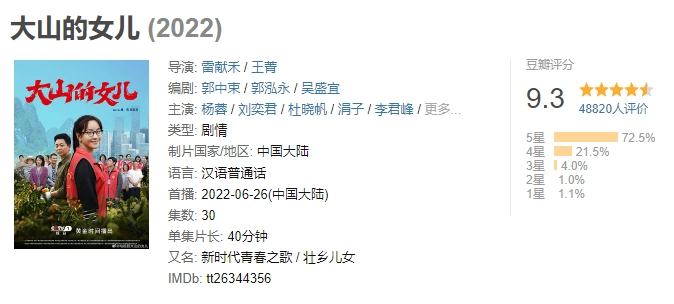 与此同时,多部小成本剧却凭借口碑突出重围,2022年大众向口碑优质剧TOP30中,排在第一位的《大山的女儿》收获了9.85的指数,这部以扶贫干部黄文秀为原型制作的扶贫攻坚类电视剧属于小众题材,但却以超高口碑在全网收获了不错的声量,成为了2022年唯一一部豆瓣评分破9分的国产剧。