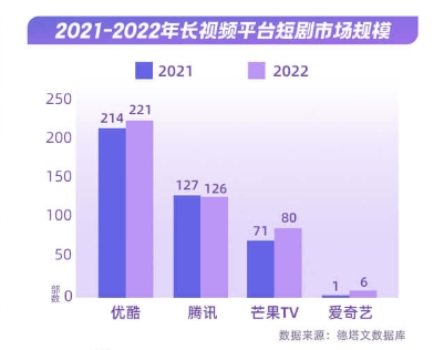 在国内的几大主流视频平台中,优酷的短剧市场规模最大,2021年到2022年间,优酷上线了超过200部短剧,而爱奇艺的短剧数量仅仅是个位数,优酷正在持续加注短剧投入。