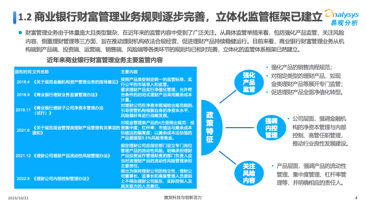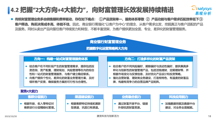 因此,商业银行需强化“以客户为中心”的理念,从客户需求出发,挖掘真正与客户适配的产品及服务。同时从卖出产品向留住客户持续发力和转型,不断丰富货架,为客户提供更加全面、专业、差异化的财富管理服务。