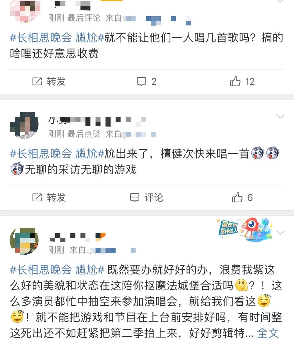 在#长相思晚会 尴尬#的热搜词条下面,也有人在回忆当年《陈情令》演唱会的盛况,“演员能唱跳,流程安排好。晚会结束的时候,一个角色一个角色告别,一个家族一个家族离开,离开一个升上去一个灯笼,氛围灯光玩到极致……”