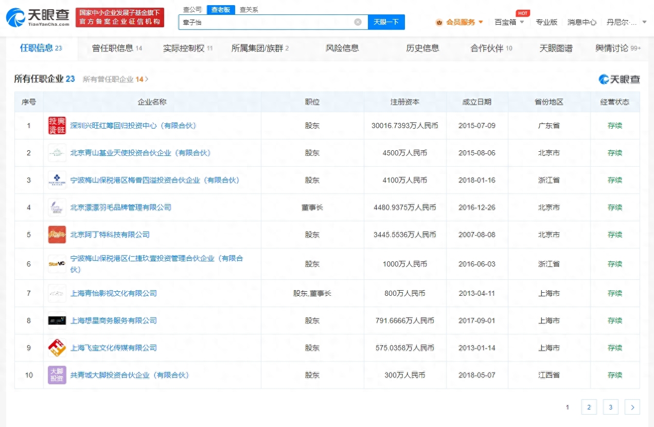 天眼查App显示,章子怡名下关联23家企业,其中13家为存续状态,包括深圳兴旺红筹回归投资中心(有限合伙)、北京漂漂羽毛品牌管理有限公司、上海青怡影视文化有限公司、北京章子怡影视文化工作室等,版图涉及影视文化、传媒、科技、投资管理等。