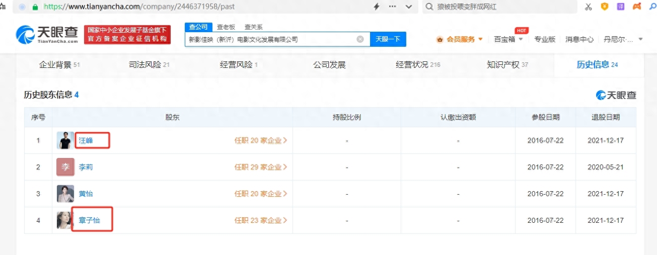 此外,天眼查显示,2021年12月17日,新影佳映(新沂)电影文化发展有限公司发生工商变更,汪峰、章子怡夫妻二人退出该公司股东行列,退出前二人在公司的持股比例均为2.26%。二人退股,也引发了外界的一些猜测。