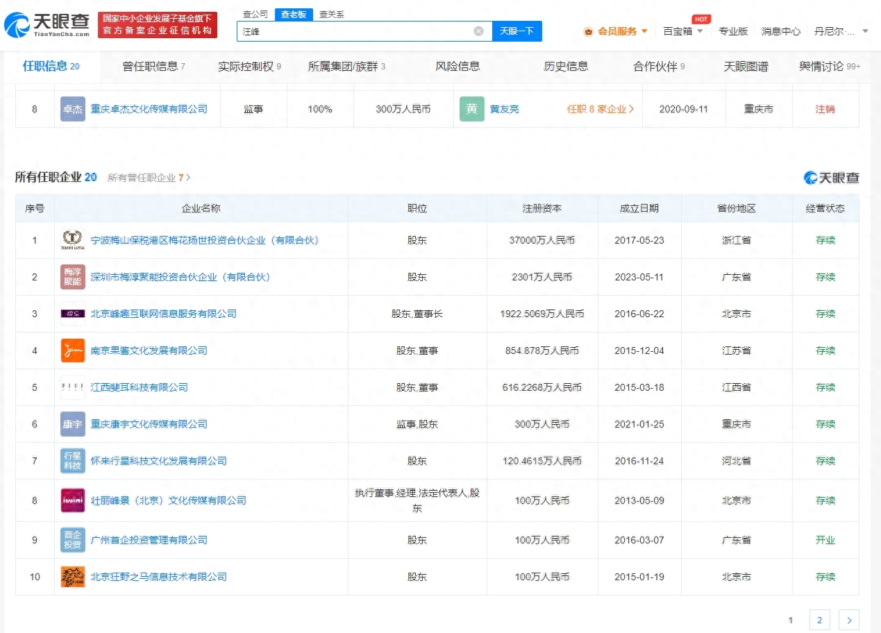 汪峰名下关联20家企业,其中13家为存续状态,包括南京果酱文化发展有限公司、江西斐耳科技有限公司、碧峰怡竹长兴文化传媒工作室等,版图涉及文化传媒、信息技术、投资管理等。