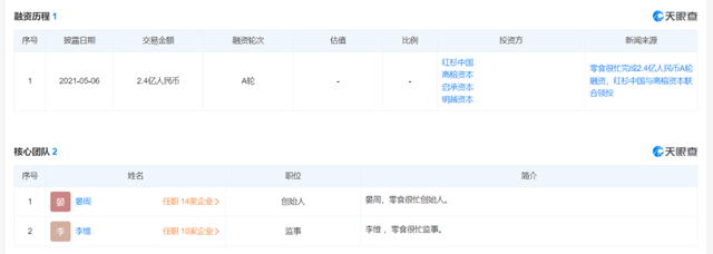天眼查数据显示,2021年5月,零食连锁品牌“零食很忙”完成2.4亿元(人民币,以下未标注则同)A轮融资,由红杉中国与高榕资本联合领投。今年2月,零食品牌“赵一鸣零食”完成由黑蚁资本领投、良品铺子跟投的1.5亿元A轮融资;5月,零食量贩连锁品牌“零食有鸣”,也完成由新希望旗下昇望基金领投的B+轮融资。