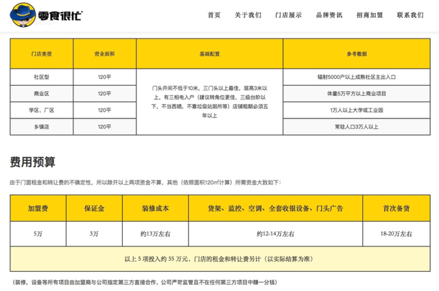 简单算一笔账就可以理解,“趣解商业”通过零食很忙官网的招商加盟内容获悉,加盟商除120平米店面的租金外,初期投入金额(包括装修、门店陈设、备货等)需要55万元,其中规定每家门店都要缴纳5万元加盟费,如从现有的3000家门店推算,零食很忙仅加盟费就有1.5亿元。