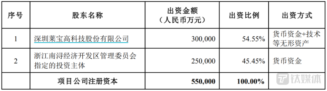 该项目计划总投资90亿元,项目合资公司注册资本55亿元。其中,莱宝高科在项目合资公司的出资比例为54.55%,资金来源为自有及自筹资金;项目合资方(地方政府指定的投资主体)拟现金出资25亿元,对项目合资公司的出资比例为45.45%,资金来源为自有及自筹资金。