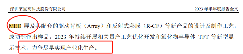 值得一提的是,除了项目建设周期长,商业化落地也不容易。2023年半年报显示,公司在MED 屏及其配套的驱动背板(Array)和反射式彩膜(R-CF)等新产品仅处于成功制作出样品阶段。![]()