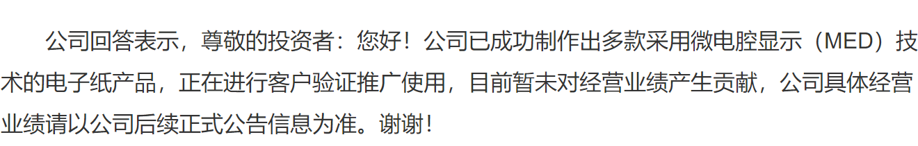 不过,愿景虽好,但是实际情况可能道阻且长。据了解,近日有投资者向公司提问,公司的电子纸业务推进的怎么样了,什么时候能有业绩贡献?公司表示,正在进行客户验证推广使用,目前暂未对经营业绩产生贡献。![]()
