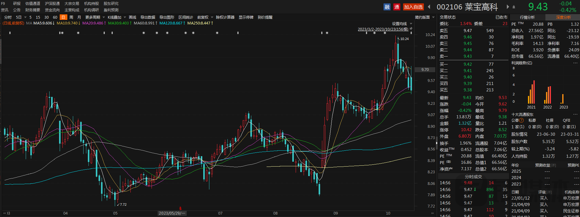 虽说此消息属于利好,但是受A股大势不佳拖累,公司股价也未能“免俗”。今日公司股票高开低走,截至10月23日收盘,公司股价收报9.43元,下跌0.42%,总市值为66.56亿元。