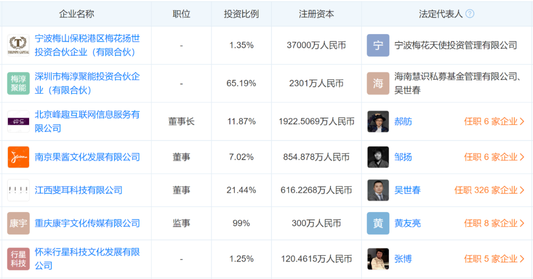 汪峰的商业版图中多是音乐领域相关公司,如主营音乐演出直播的北京狂野之马信息技术有限公司;如聚焦社交营销与社群管理服务,主营业务围绕音乐展开的南京果酱文化发展有限公司;以及音乐软件菠萝BOLO(原名碎乐)背后的北京峰趣互联网信息服务有限公司,碎乐最初由汪峰团队创办,后被著名乐评人郝舫接手,不过,目前汪峰仍在北京峰趣持股11.87%。