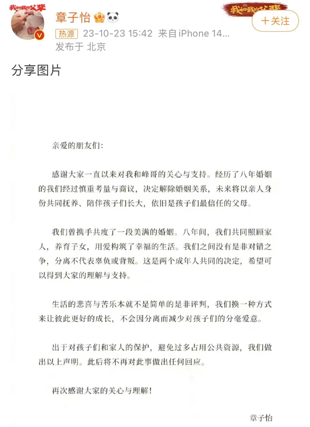 在明星离婚逐渐体面化的当下,吃瓜也愈发索然无味,官宣消息热度起得快淡得更快,当事人和网友都如同在走手续一般。或许最终更有看头的,还是粉丝们最在意的事业吧。