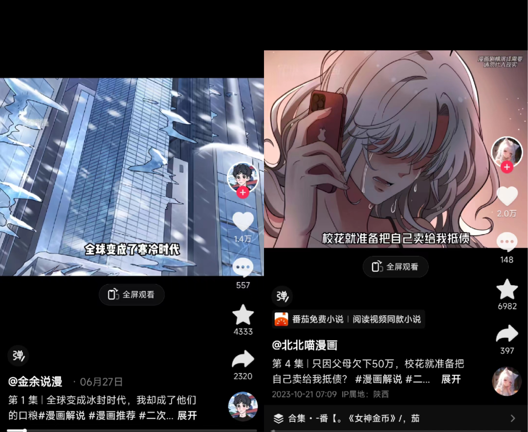 “但漫画是不需要的。漫画为了吸引读者,本身就已设计好了节奏,1到2章刚好做一期视频,甚至文案都只需要在原漫画文案上进行优化。题材也是偏热门网文,很容易戳中观众。”