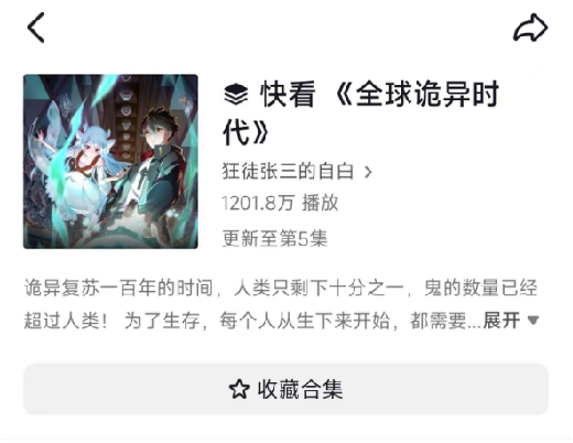 以国漫榜排名第一的《全球诡异时代》为例,原著来自于飞卢小说网于2021年末已经完结的独家签约小说,讲述了诡异复苏,全球进入人鬼并存时代发生的故事。相比于传统电影内容,由网文改编的漫画脑洞更大,设定更为新颖,能在信息流中快速捕获观众的好奇。这部作品在抖音账号“狂徒张三的自白”做成漫画解说视频后,仅5集内容就收获共1201.7万播放。