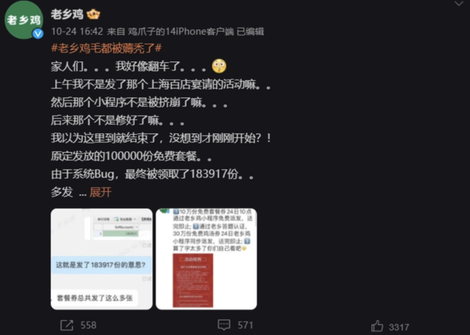 2022年十月下旬,老乡鸡为了庆祝在上海门店突破100家,计划通过小程序发放10万份餐券,请上海顾客免费吃饭。但在活动时,老乡鸡后台被挤爆,消费者抢劵被卡。随后老乡鸡表示小程序修复后又出现bug,原定于发放100000份免费套餐,最终被领取了183917份。
