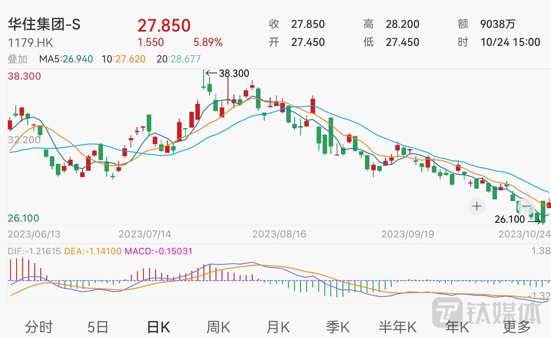 受业绩向好影响,叠加多家机构给出不错评级,华住集团-S股价迎来上扬,截至10月24日发稿前,公司股价报27.85港元,涨5.89%,成交额为9037.18万港元,当前公司总市值约884.11亿港元。