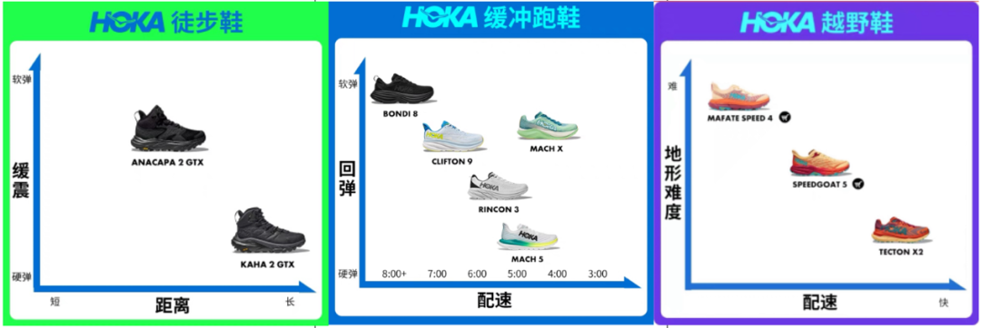 HOKA在「缓震、稳定、回弹、轻量」几大方面细致地挖掘用户需求。其中,跑鞋又分为缓冲跑鞋、竞赛跑鞋、稳定跑鞋和越野跑鞋。其SKU少而精,但每个场景或功能下都有让用户喜爱的代表鞋款。