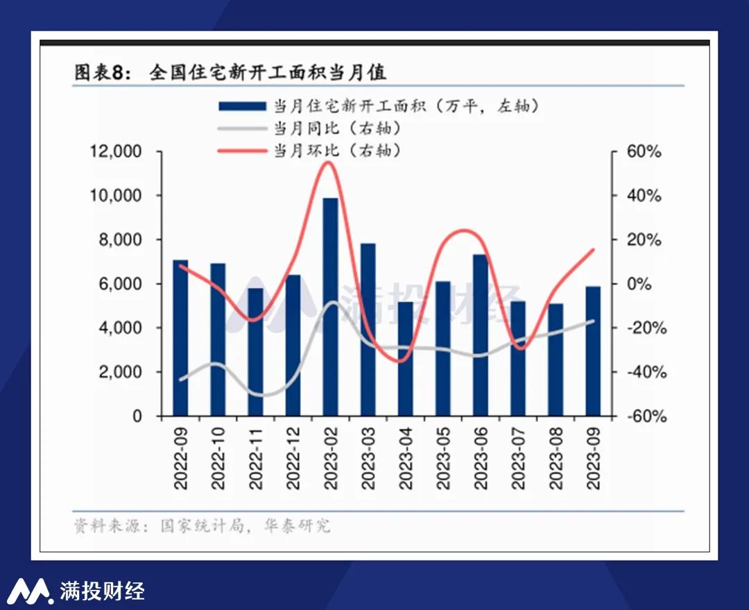 从开工数据来看,9月地产业新开工面积、施工面积数据得到了大幅回升,降幅分别收窄了8.9%、25.7%。而竣工面积则有所提升,提升了14.8%到25.3%。9月新开工面积同比增长为18.9%,为近5年同期最高数据。